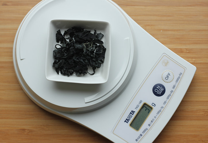 若竹煮のように煮込み料理に使う場合は、戻し時間は短めに。2分~3分で十分です。水分を含み過ぎたわかめは“溶けた”ような状態になり、食感がなくなってしまいます。乾燥わかめは水でもどすと10~14倍に増えるそう。カットわかめなら1人前はティースプーン1杯、3g程度が目安です。