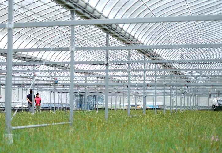 現在、康嗣さんはトマトのハウスを新設したばかり。これから土を耕し整えて、8月に定植し11月頃から収穫をしながら旬である1月~2月までにトマトの味を調えていきます。建てたハウスはとても背が高く大きなタイプで、農業担い手育成センターで使っているものと同じ環境制御型です。環境制御とは栽培方法の技術で、温度の管理やミストでの湿度管理と炭酸ガスでトマトの生育をトータルで管理する仕組みになっています。