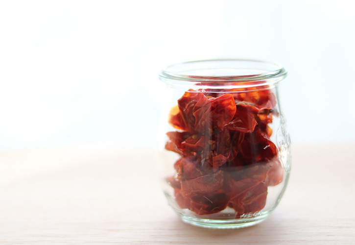 すぐに料理に使えるようにオリーブ油漬けにして保存するのもよいでしょう。清潔な瓶の中にドライトマトを詰めて、オリーブ油をドライトマトが十分に隠れるように注ぎます。段々とオリーブ油がドライトマトに染みて柔らかくなり、パスタやピザを作るときに重宝します。オイル漬けを作るときに、ローズマリーや月桂樹などのお好みのハーブを一緒に入れても、よい香りがついてとても美味しくなります。