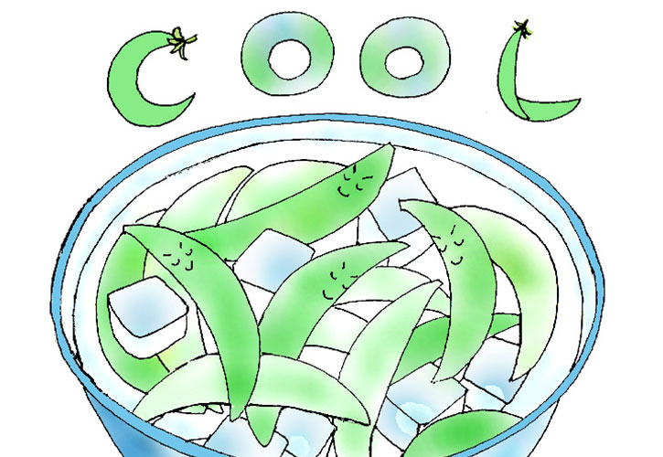 茹でたあと、そのままざるにあげて冷ますことを「陸上げ(おかあげ)」または「生上げ(きあげ)」といいます。水で冷ますことで、水っぽくなることを嫌う場合にこの方法を使います。確かに、「陸上げ」したものの方が味が少し濃く感じました。ただスナップエンドウのシャキシャキッとした食感、鮮やかな色は冷水につけた方が美味しく仕上がります。